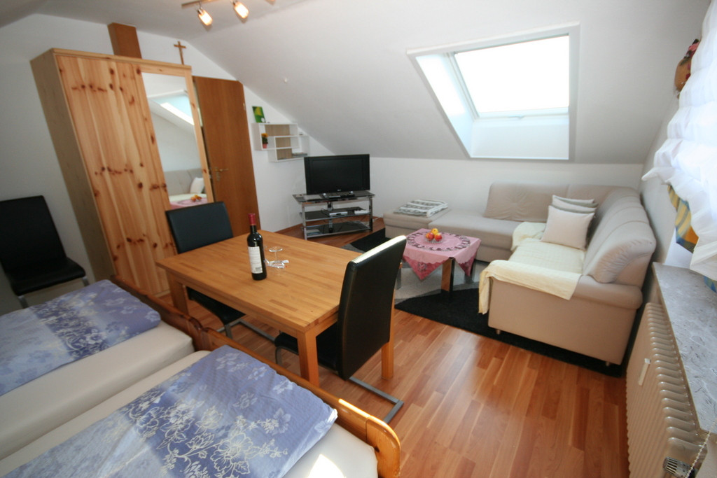 Im Wohnschlafzimmer befindet sich zwei Einzelbetten die normalerweise zum Doppelbett zusammengestellt sind. Ein Esstisch für 3 Personen, eine gemütliche Couch sowie ein LED-TV mit Satelliten-Empfang rundet den Bereich des Wohnschlafzimmers ab.